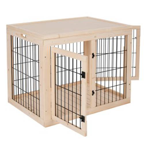 Klatka dla psów, do krótkotrwałego zamknięcia, naturalne kolory drewna, 2 wejścia, solidne drzwi kratowe z metalowymi ryglami, odczepiana podłoga, solidny dach, wykonany z drewna z żelazną kratą