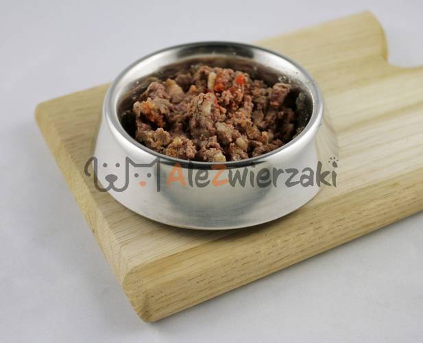 Skład: filet z łososia 26%, kurczak (serca z kurczaka, wątroba z kurczaka), wołowina (nerki wołowe), marchew 4%, ryż naturalny brązowy 4%, substancje mineralne, łupiny i nasiona psyllium.