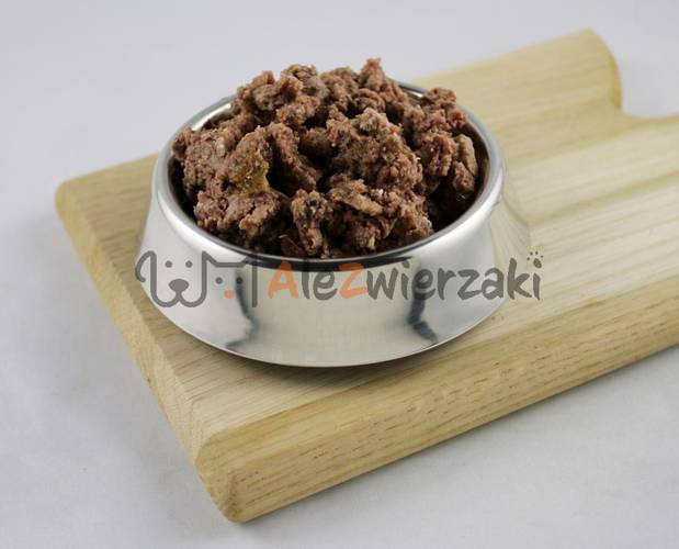 Skład: wołowina 22% (płuca, wymiona, żołądki), rosół, wieprzowina 16% (serca, wątroba), kaczka 14%, kurczak 10% (wątroba), dynia 4%, jaja 3%, węglan wapnia, trójpolifosforan sodu, olej lniany 0,2%, nasiona psyllium 0,2%, chlorek potasu, bazylia 0,01%.