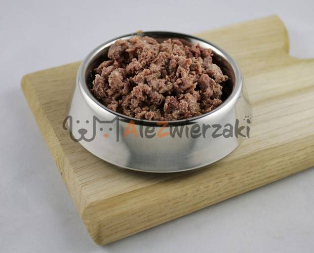Skład: wołowina 30% (serca wołowe 15%, płuca), rosół, kurczak 20% (wątroba, żołądki), wieprzowina 10% (mięso wieprzowe), indyk 5% (skóry), jaja 5%, marchew 2%, węglan wapnia, trójpolifosforan sodu, drożdże piwne 0,2%, chlorek potasu, olej z łososia 0,15%, nasiona psyllium 0,1%, olej lniany 0,08%, jukka Mojave 0,02%.