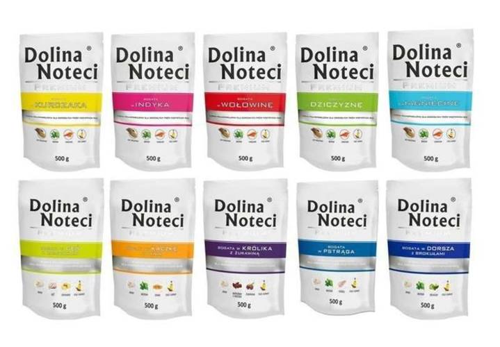 Dolina Noteci Premium MIX smaków 10x500g Aby dbać o Twojego pupila codziennie, skład karmy został skomponowany w taki sposób, by zapewnić obecność wysokiej jakości składników odżywczych gwarantujących prawidłowy przebieg wszystkich procesów metabolicznych. Mięso z kurczaka stanowi źródło cynku…