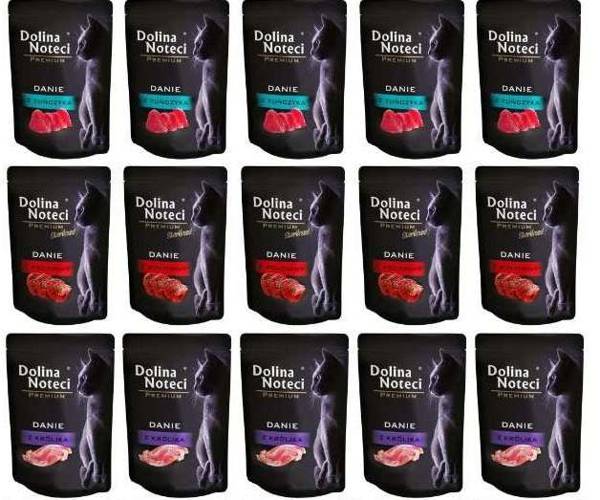Zestaw zawiera:Dolina Noteci Premium 85g Danie z Królika x 8 Dolina Noteci Premium 85g Sterilised Danie z Wołowiny x 8 Dolina Noteci Premium 85g Danie z Tuńczyka x 4 DOLINA NOTECI danie z królika saszetka dla kota 85g Bezzbożowa karma mokra danie z królika pokrywa w 100% dzienne zapotrzebowan…