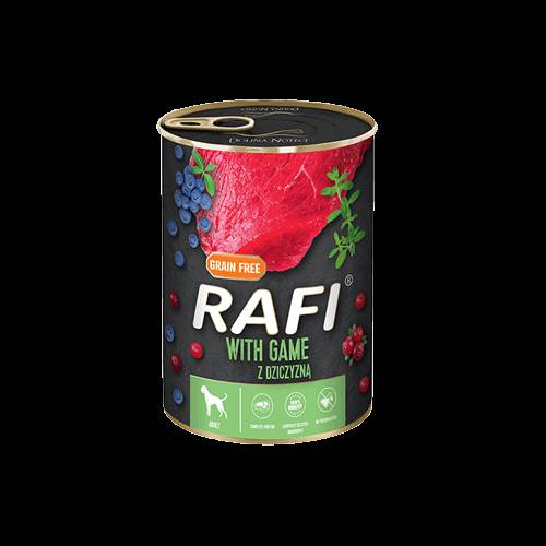 Mokra karma Rafi z dziczyzną charakteryzuje się wysoką zawartością pełnowartościowego białka oraz nienasyconych kwasów tłuszczowych, głównie n-3 odpowiedzialnych za wspieranie odporności. Mięso i surowce pochodzące z dziczyzny uzupełniają recepturę o aminokwasy - metioninę, izoleucynę i cystynę. Karma zawiera selen i miedź w ilościach pokrywających zapotrzebowanie dorosłego psa. Dodatek owoców: borówki amerykańskiej i żurawiny, dzięki występującym w nich związkach biologicznie czynnych, głównie procyjanidyn i flawonoidów, wykazuje silne właściwości przeciwutleniające i przeciwzapalne. Z kolei tymianek sprawia, że karma jest bardziej smakowita.
