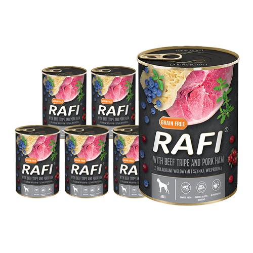Mokra karma Rafi z żołądkami wołowymi i szynką wieprzową zawiera: