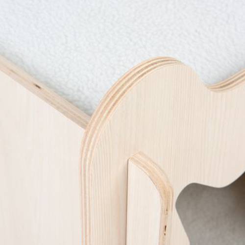 Dwupiętrowy, drewniany domek dla kota, 2 wygodne miejsca do leżenia (na dachu i wewnątrz), z miękką poduszką, z bocznymi otworami wentylacyjnymi, do montażu bez narzędzi, kolor: beżowo-biały