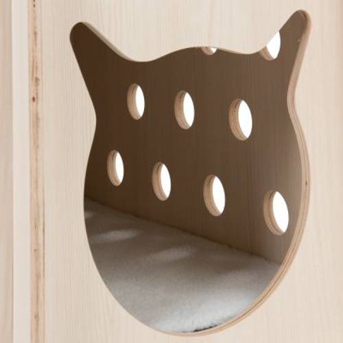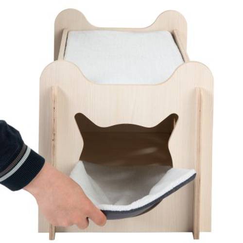 Jak wiadomo, koty lubią same decydować, gdzie spędzą swój cenny czas. Domek dla kota Peekaboo oferuje im dwie wygodne powierzchnie do leżenia: jedną na dachu, a drugą w przytulnym domku.To dwupiętrowe kocie legowisko jest wykonane z drewna powlekanego melaminą i zapewnia kotu dwa poziomy użytkowe. Miejsce na dachu idealnie nadaje się do ucięcia sobie drzemki i obserwacji otoczenia, wnętrze domku to z kolei przyjemne miejsce odosobnienia. Tutaj kot może się schować i zapaść w głęboki sen. Wysoki komfort zapewnia zwierzęciu dwustronna poduszka. Do domku prowadzi obszerne wejście w kształcie kociej głowy. Dzięki wtykanym modułom budkę Peekaboo można zmontować w mgnieniu oka.