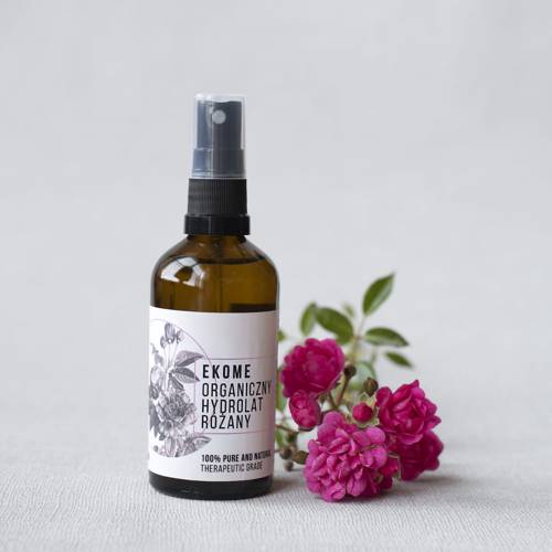 Ekome Organiczny Hydrolat różany (rosa damascena water). Jakość terapeutyczna, hydrolat certyfikowany, pochodzący z surowców z kontrolowanych upraw ekologicznych.