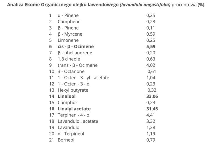 Analiza Ekome Organicznego olejku lawendowego (lavandula angustifolia) procentowa (%):
