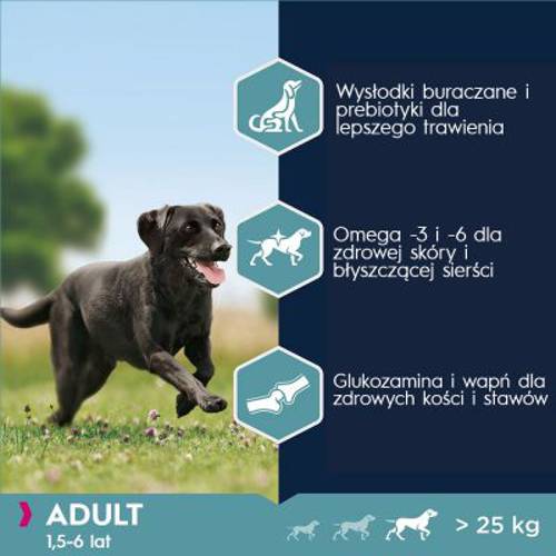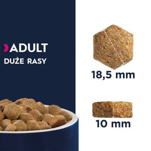 - W 100% zrównoważony i pełnowartościowy: skład dostosowany do potrzeb dużych psów (25-40 kg) i bardzo dużych psów (> 40 kg).