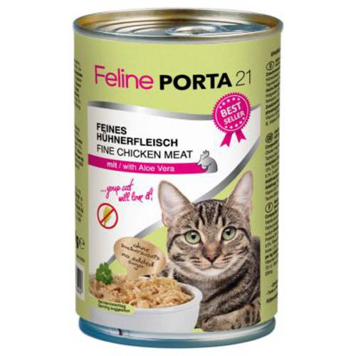 Feline Porta 21 karma dla kotów, z duża ilością mięsa w całych kawałkach, z naturalnymi składnikami, witaminami, minerałami, tauryną, lekkostrawna, bez dodatku cukru, dostępna w wielu smakach