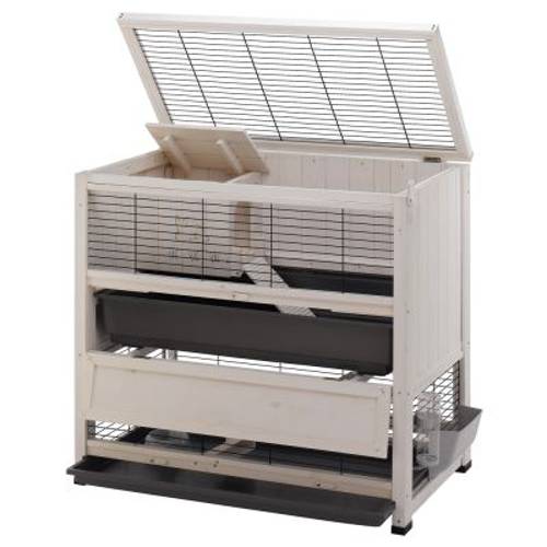 Ferplast Dwupiętrowa klatka dla królików z białego drewna sosnowego z motywami królików i trawy, z extra głęboką dolną częścią i oddzielnym domkiem do spania