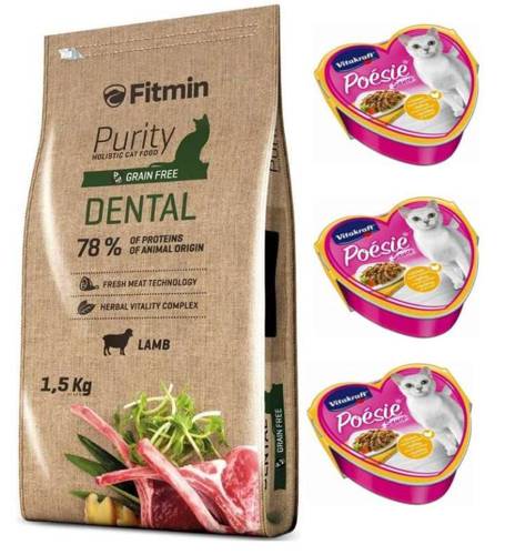 Uczta kulinarna dla Twojego kota. Karma Fitmin cat Purity Dental. Znajdziesz w niej bogate proporcje jagnięciny, zioła wspierające witalność organizmu, owoce i warzywa. Nie tylko zadowolisz podniebienie swojego kota, ale także podarujesz mu pierwszorzędną jakość karmy. Fitmin cat Purity Dental to tzw. karma grain free, co oznacza, że jest bezglutenowa i zmniejsza potencjalne ryzyko reakcji alergicznych (np. na gluten pszenny i kukurydziany). Unikalny skład sprawia, że karma jest idealna dla kotów, które mają problemy z uzębieniem czy higieną jamy ustnej. Dzięki niemu uzębieniem Twojego kota będzie we wspaniałej kondycji. Karma zawiera mieszankę ziołową, która ma wiele właściwości dobroczynnych dla zdrowia. Karma jest produkowana przy użyciu najnowszych technologii, jest zbilansowana, zawiera dużą ilość składników pochodzenia zwierzęcego oraz pozostałych korzystnych dla zdrowia komponentów, zwłaszcza kompleks do pielęgnacji zębów, prebiotyki, chelaty i wiele innych.