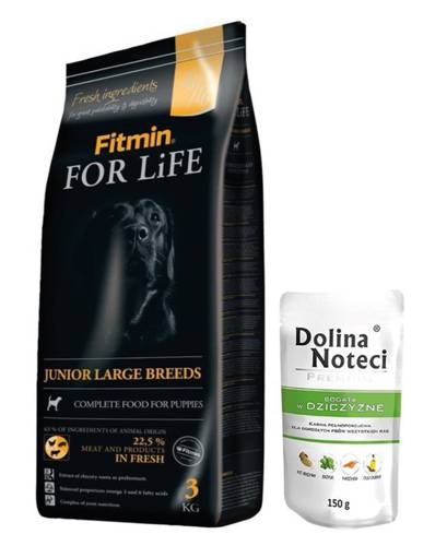 Karma Fitmin Dog For Life Junior Large Breed powstała z troski o potrzeby szczeniąt psów ras dużych i olbrzymich. Dzięki odpowiednio dobranym proporcjom białek, tłuszczy i wapnia, piesek rozwija się prawidłowo i harmonijnie. Karma jest także mniej kaloryczna od karm dla mniejszych psów, co zapobiega powstawaniu nadwagi. Z uwagi o silny rozwój chrząstki stawowej została wzbogacona glukozaminą i siarczanem chondroityny. Ryż zawarty w karmie jest łatwostrawny i nie podrażnia jelit, a kukurydza dostarcza odpowiednią ilość witamin, potasu i błonnika. Unikalny smak każdej granulki gwarantują występujące tuż przy powierzchni świeże mięso i ekstrakt wątrobowy.