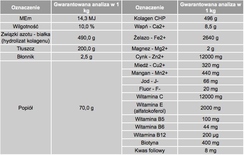 Kolagen CHP 2480 mg; wapń 42,5 mg; magnez 10 mg; żelazo 13,2 mg; cynk 60 mg; miedź 1,6 mg; mangan 2,2 mg; jod 0,33 mg; fluor 0,1 mg; witamina C 60 mg; witamina E 10 mg; witamina B5 0,5 mg; witamina B6 0,22 mg; witamina B12 1 µg; biotyna 2000 µg; kwas foliowy 40 µg.