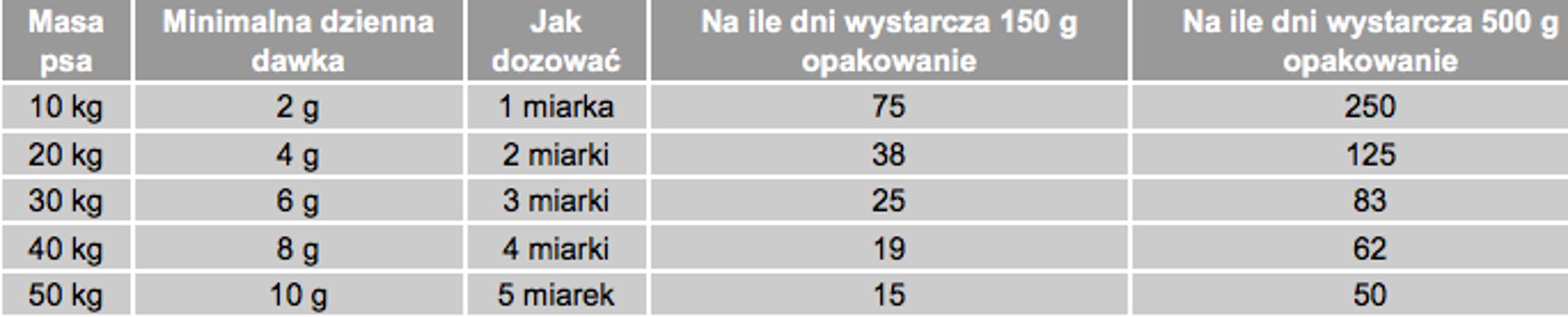 Instrukcja stosowania: Należy odmierzyć dzienną dawkę według tabelki w zależności od masy psa. Preparat wsypujemy do karmy i zalewamy niewielką ilością wody tak, aby doszło do zmieszania preparatu z karmą.