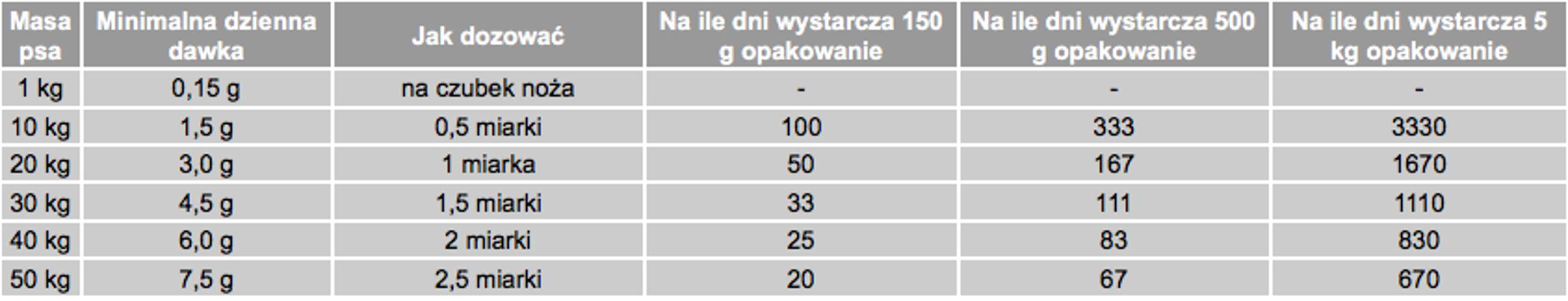 Odmierzyć odpowiednią dawkę według poniższej tabeli, dodać do karmy i lekko zwilżyć, aby preparat lepiej zmieszał się z karmą, podawać codziennie przez co najmniej 2-3 miesiące, zaleca się ciągłe stosowanie przy ostrych dolegliwościach.