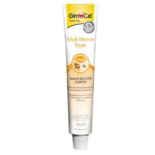Koty potrzebują witamin, aby utrzymać zdrowie i sprawność. Często organizm nie jest w stanie sam zapewnić sobie ich odpowiednią ilość. Pasta multiwitaminowa GimCat zawiera 12 najważniejszych witamin, przez co wspomaga regenerację organizmu. W jej recepturze zrezygnowano z dodatku cukru.