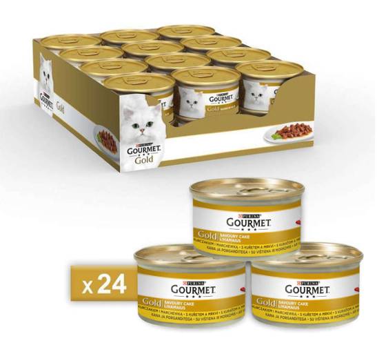 Nawet najbardziej wybredne z kotów będą zachwycone GOURMET® Gold: menu wykwintnych dań, które różnorodnością tekstur i smaków rozpieszczają wyrafinowane podniebienia każdego dnia. Właśnie dlatego stworzyliśmy GOURMET® Gold Savoury Cake - delikatnie posiekane mięsne kawałki, z dodatkiem wyselekcjonowanych warzyw, zaakcentowane pysznym sosem. Jak mógłbyś powiedzieć nie?
