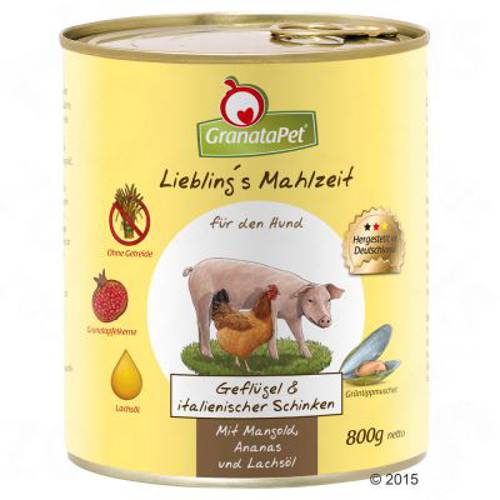 Wyszukana i bogata w białko karma jest podstawą zdrowego żywienia psa. Ponadto, decydująca jest jakość użytych składników. GranataPet Liebling's Mahlzeit oferuje Twojemu pupilowi zdrowe pożywienie, odpowiadające jego naturalnym potrzebom. Zboża są unikane w karmach GranataPet Liebling's Mahlzeit , jako że są one dla wielu psów ciężkostrawne i trudno przyswajalne, przez co często prowadzą do alergii. Wysoka zawartość mięsa zapewnia optymalną ilość białka zwierzęcego i łatwość trawienia. Małż zielony jest bogaty w glukozaminę i chondroityny, dzięki czemu wspomaga mocne kości i połączenia stawów. Karma zawiera zbalansowane składniki odżywcze jak: kwasy Omega -3 i Omega-6 oraz nasiona granatu, który wpływa korzystnie na komórki, tkanki, serce, układ krwionośny, a także mózg i oczy. Inne składniki jak: ziemniaki, żurawina, owoce dzikiej róży, koper, cukinia, dynia i twaróg oraz cenne oleje zapewniają świetny smak i dostarczają wszystkich niezbędnych dla Twojego psa składników odżywczych, witamin i minerałów.Ta smaczna i wartościowa karma produkowana jest całościowo w Niemczech. Tylko świeże i najlepsze składniki są używane do jej produkcji. Sposób przygotowywania karmy sprawia, że jej składniki nie tracą żadnych swoich wartości odżywczych.
