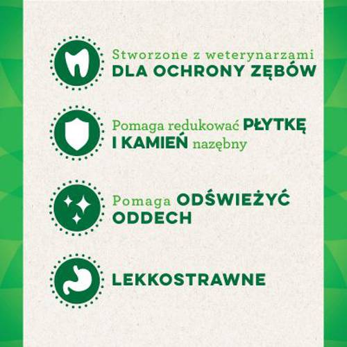 Bezzbożowy przysmak dla psa pielęgnujący zęby, opracowany przez weterynarzy, naturalne składniki, wyśmienity smak, czyści zęby i zapewnia świeży oddech, redukuje tworzenie się kamienia nazębnego