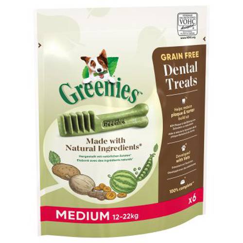 Bezzbożowy przysmak Greenies powstał z pomocą lekarzy weterynarii, którzy specjalizują się w pielęgnacji zębów. W skład wchodzą naturalne składniki takie jak mięso, owoce, minerały oraz witaminy. Szczególna konsystencja przekąski sprawia, że Twój pies może żuć go przez bardzo długi czas, a tekstura przyczynia się do redukcji i zapobiega tworzeniu się kamienia nazębnego. Dużym atutem przysmaku Greenies jest nie tylko jego wyjątkowy smak, ale również smaczny i zachęcający wygląd. Smakołyk z jednej strony przypomina kość, a z drugiej – szczoteczkę do zębów.