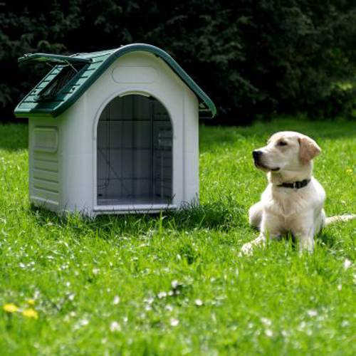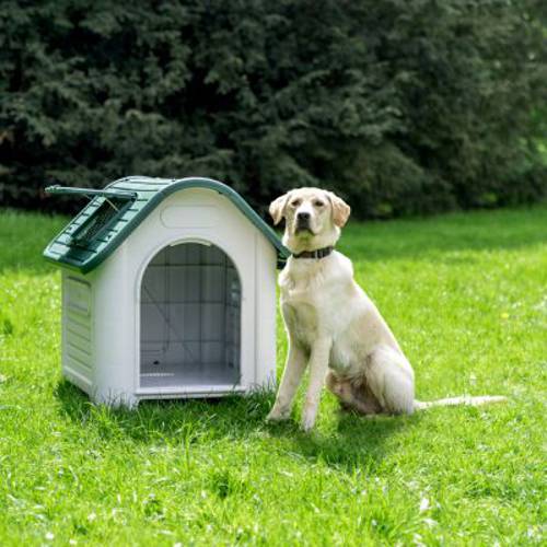 - Domek dla psa wykonany z tworzywa sztucznego odpornego na warunki atmosferyczne do użytku wewnętrznego i zewnętrznego.