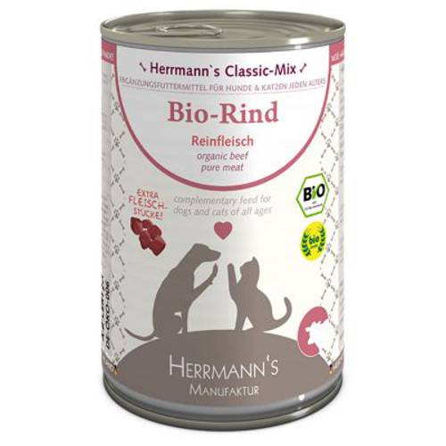 Herrmann's Czyste Mięso to zbilansowana, zdrowa i stworzona z myślą o potrzebach psów i kotów karma mokra, której składniki odznaczają się najwyższą, certyfikowaną jakością ekologiczną i pochodzą z kontrolowanych ekologicznych hodowli lub bezpośrednio ze środowiska naturalnego. Wszystkie surowce są pozyskiwane z regionu Górnej Bawarii, gdzie znajdują się również zakłady produkcyjne Herrmann's. W firmie Herrmann's zwraca się szczególną uwagę na jakość i etykę. Ubój odbywa się bezpośrednio na farmach, aby uniknąć transportu zwierząt. Przeprowadzaną są także skrupulatne kontrole podawanej zwierzętom karmy. Stosowanie antybiotyków i innych substancji przyspieszających wzrost zwierząt jest wykluczone! Zwierzęta są hodowane na wolnym wybiegu lub regularnie wypasane w naturalnych warunkach.Herrmann's Czyste Mięso to świetny wybór dla opiekunów psów lub kotów, którzy pragną zrezygnować z podawania swoim pupilom węglowodanów i błonnika pokarmowego lub preferują samodzielne wzbogacanie karmy świeżymi warzywami.