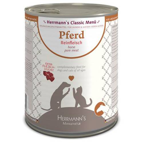 Karma mokra Herrmann's dla psów i kotów, ze starannie duszonej koniny, idealna dla zwierząt z alergiami i niestrawnościami, jako uzupełnienie karmy lub podczas diety zdrowotnej