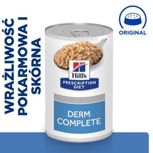 Dietetyczna karma dla psów charakteryzuje się ograniczoną liczbą wybranych źródeł węglowodanów i białka. Pokarm zawiera również wysoki poziom kwasu linolowego, EPA i DHA. W ten sposób mokra karma dla psów Hill's Prescription Diet Derm Complete może wspierać naturalną barierę skórną.