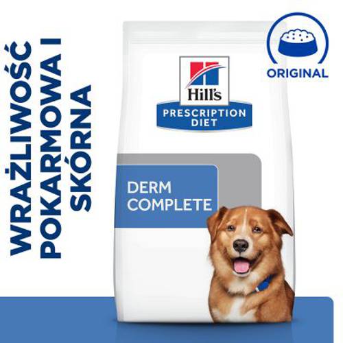 Hill's Prescription Diet Derm Complete została opracowana z myślą o dorosłych psach zmagających się z alergiami wywołanymi przez czynniki środowiskowe lub przez pokarm. Dietetyczna karma pełnoporcjowa charakteryzuje się wysoką zawartością esencjonalnych kwasów tłuszczowych, aby jak najkorzystniej wpływać na zdrowie skóry. Dzięki temu bariera naskórka może się rozwijać prawidłowo, a tym samym zmniejszać ryzyko pojawienia się alergicznych reakcji na czynniki środowiskowe lub składniki pokarmowe.