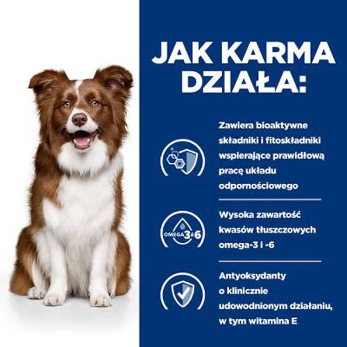 Smaczny posiłek z 17% zawartością kurczaka zawiera wyjątkową dużą ilość niezbędnych kwasów tłuszczowych omega-3 i omega-6. Ponadto receptura karmy zawiera wyważoną mieszankę witamin, minerałów, elementów śladowych oraz beta-karotenu i naturalnych przeciwutleniaczy. Dzięki niej pies wspierany jest we wszystkich czynnościach życiowych, a system immunologiczny jest wzmacniany. Wysokojakościowa karma, polecana przez lekarzy weterynarii, która w efektywny sposób wspiera funkcje ochronne skóry oraz poprawia kondycję sierści.