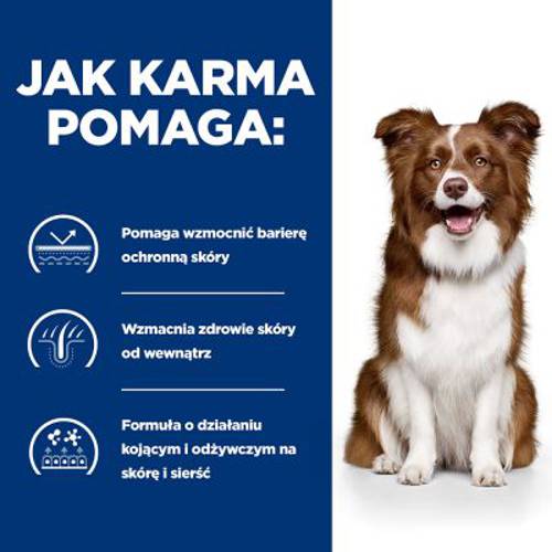 Dietetyczna karma pełnoporcjowa dla dorosłych psów cierpiących na dermatozę lub wypadanie sierści, specjalny kompleks substancji bioaktywnych dla zdrowia i odporności skóry