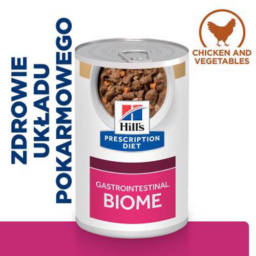 Hill's Prescription Diet Gastrointestinal Biome Ragout, kurczak to mokra karma dietetyczna dla dorosłych psów, idealna w przypadku problemów trawiennych. Unikalna technologia ActivBiome+ to mieszanka aktywnego błonnika, który odżywia mikrobiom jelitowy i może wspierać prawidłowe funkcjonowanie jelit.