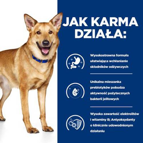 Wysokostrawna, dietetyczna karma pełnoporcjowa dla psów z problemami trawiennymi, ze zwiększoną zawartością elektrolitów, specjalną mieszanką włókien prebiotycznych, naturalne przeciwutleniacze