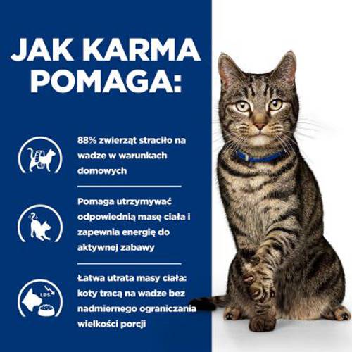 Hill's Prescription Diet Metabolic z kurczakiem - redukcja wagi to karma stworzona specjalnie dla dorosłych kotów, które zmagają się z nadwagą. W większości przypadków przyczyną tego problemu jest zbyt kaloryczna dieta oraz brak ruchu. Szczególnie narażone na nadwagę są wykastrowane koty domowe. Dietetyczna karma Hill's Prescription Diet Metabolic Weight Management została opracowana specjalnie dla kotów z tendencją do tycia.