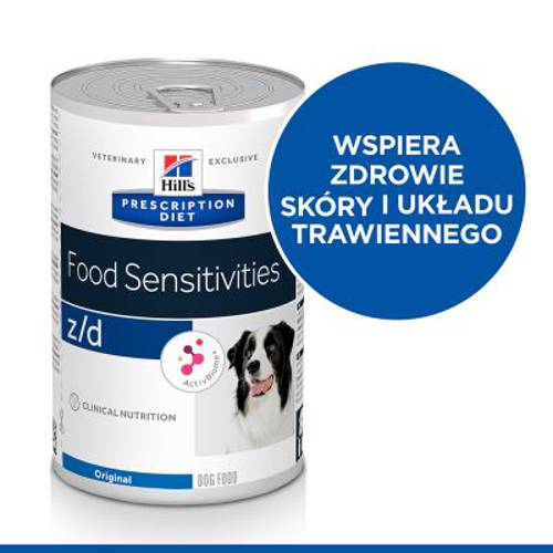 Dietetyczna karma dla psów zawiera tylko jedno wybrane źródło białka i węglowodanów. Białko jest w wysokim stopniu hydrolizowane, co zapewnia jego dobrą strawność. Hill's Prescription Diet z/d Food Sensitivities została wzbogacona w zwiększoną ilość niezbędnych kwasów tłuszczowych pochodzących z oleju rybiego i witaminy E, które mogą przyczynić się do prawidłowego stanu skóry. Pokarm jest źródłem włókien prebiotycznych, które wspomagają prawidłowe trawienie.