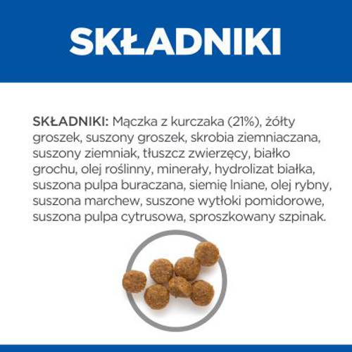 Zapewnia wszystkie korzyści karmy Hill's SCIENCE PLAN, a ponadto nie zawiera zbóż ani glutenu.