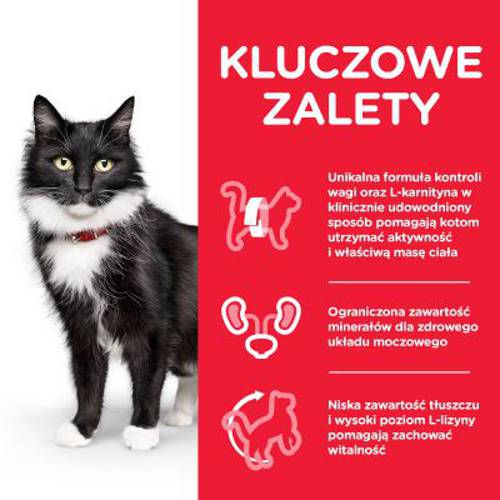 Gdy wykastrowane koty zaczynają się starzeć, wówczas ich niższe zapotrzebowanie energetyczne spowodowane mniejszą aktywnością może dalej spadać. Karma Hill's Science Plan Mature Adult Sterilised (kurczak) ułatwia kotom na tym etapie życia osiągnąć i utrzymać prawidłową wagę. Pomocne mogą okazać się L-karnityna oraz odpowiednia zawartość tłuszczu i wartość energetyczna.