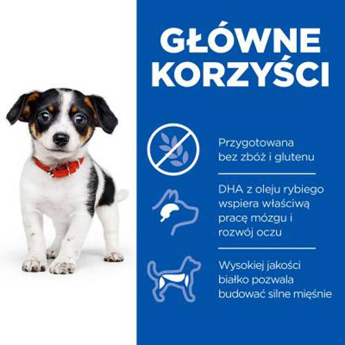 Zapewnia wszystkie korzyści karmy Hill's SCIENCE PLAN, a ponadto nie zawiera zbóż ani glutenu.