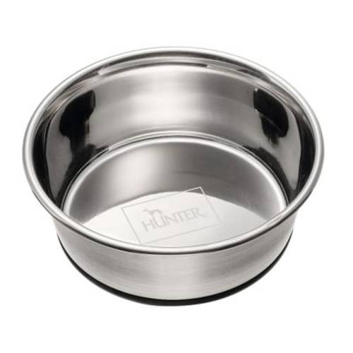 Wysokiej jakości miska dla psa z odpornej na rdzę stali szlachetnej, z logo producenta HUNTER. Przeznaczona do mycia w zmywarce, higieniczna i stabilna