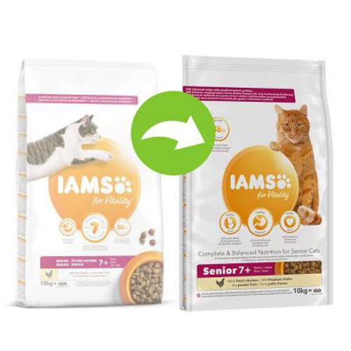 Receptura karmy IAMS for Vitality Senior ze świeżym kurczakiem została dostosowana do potrzeb żywieniowych kotów w wieku powyżej 7. roku życia. Ponieważ koty w zaawansowanym wieku są mniej aktywne fizyczne i bardziej podatne na różne choroby, substancje zawarte w karmie wzmacniają mięśnie i odporność organizmu. Karma w 42% składa się z niskotłuszczowego drobiu, dzięki czemu jest świetnym źródłem białek. Zawiera także l-karnitynę, która przyspiesza przemianę materii. Przeciwutleniacze i dobra strawność karmy sprawiają, że siły odporne organizmu kota pozostają mocne mimo zaawansowanego wieku.Specjalne substancje odżywcze działają zdrowotnie na stawy i kości, które u kotów w zaawansowanym wieku są bardziej obciążane, oraz mają pozytywny wpływ na uzębienie. Zawarta w kurczaku i indyku tauryna wzmacnia wzrok i serce. Specjalny kształt krokiecików ułatwia gryzienie. Smaczne składniki i wyjątkowa receptura nadają krokiecikom wyjątkowego aromatu, co gwarantuje dobrą akceptację nawet ze strony wybrednych kotów. IAMS dostarcza wszystkich niezbędnych substancji witalnych potrzebnych do osiągnięcia dobrostanu przez kota.