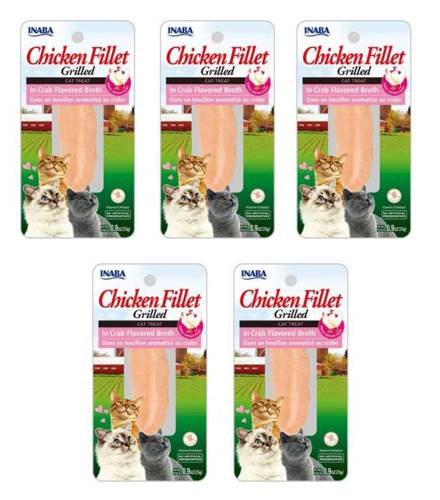 INABA Grillowany filet to ręcznie cięte kawałki najlepszej jakości kurczaka z farm z wolnego wybiegu. Nie zawiera zbóż, są lekko grillowane i zanurzone w wykwintnym bulionie z krabów. Przysmaki wyróżniają się wysoką zawartość naturalnej wilgoci co ma ogromne znaczenie dla kotów, które nie lubią pić wody.