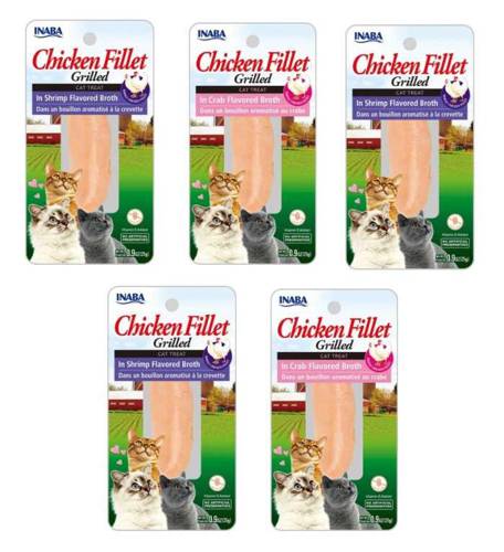 INABA Grillowany filet to ręcznie cięte kawałki najlepszej jakości kurczaka z farm z wolnego wybiegu. Nie zawiera zbóż, są lekko grillowane i zanurzone w wykwintnym bulionie z krabów. Przysmaki wyróżniają się wysoką zawartość naturalnej wilgoci co ma ogromne znaczenie dla kotów, które nie lubią pić wody.
