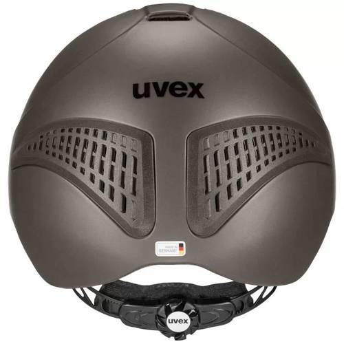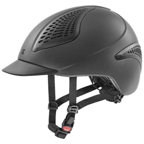 Kask Exxential II - Uvex posiada także system MONOMATIC, który umożliwia łatwe zapinanie i rozpinanie kasku jedną ręką w każdych warunkach. Miękki daszek zabezpiecza zarówno jeźdźca jak i konia przed potencjalnymi zranieniami.