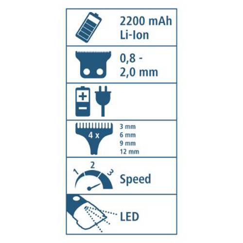 Łatwe w użyciu pokrętło umożliwia ustawienie jednej z 5 długości strzyżenia od 0,8 do 2,0 mm bezpośrednio na maszynce. Przy pomocy dołączonych do zestawu 4 nakładanych grzebieni możesz skracać sierść do 3, 6, 9 i 12 mm.