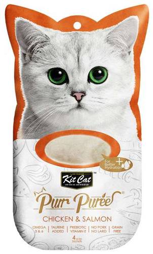 Kit Cat PurrPuree Kurczak & Łosoś Kit Cat PurrPuree to saszetki z delikatną polewą o konsystencji kremu, którą możesz serwować na różne sposoby: Bezpośrednio z saszetki Na miseczce jako samodzielny przysmak Na codziennej karmie, aby dodać jej smakowitości - sposób polecany zwłaszcza dla wybred…