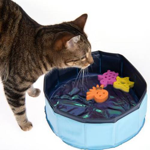 Kitty Pool to doskonała zabawka dla kota w formie małego baseniku z trzema pływającymi po wodzie zabawkami i kolorową podłogą odbijającą światło, składana, kolor: niebieski