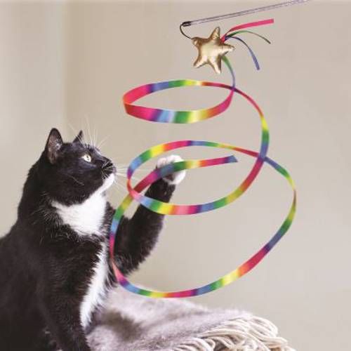 Wędka dla kota, z bardzo długą, intrygującą taśmą i ćwierkającą gwiazdą z mikrochipem, kolorowa, porusza się w nieprzewidywalnych kierunkach, wzbudza ciekawość, interaktywna, długość: ok. 304 cm