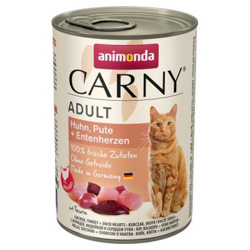 Koty są z natury mięsożercami i to właśnie na tym składniku opiera się ich naturalna dieta. Pożywienie składające się z samych składników roślinnych nie jest zgodne z zasadami naturalnego żywienia zgodnego z dobrostanem tego gatunku, ponieważ nie dostarcza kotu wszystkich istotnych składników odżywczych. W szczególności zawarte w diecie zboża są czynnikiem często wywołującym nietolerancje pokarmowe, a oprócz tego są dla kota ciężkostrawne. Z tego powodu receptura karmy Animonda Carny Adult jest całkowicie pozbawiona dodatku zbóż. Karma nie zawiera także soi, która również charakteryzuje się wysokim potencjałem alergennym.