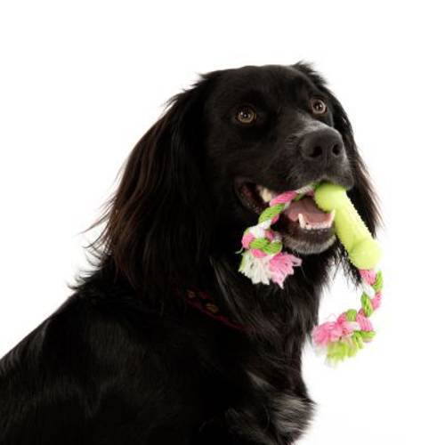 Uroczy sznurek pleciony z jasnozielonych, różowych i białych włókien, zakończony z obu stron węzłem, to idealna zabawka dla szczeniąt i psów małych ras, wspomagająca poprzez zabawę utrzymanie dobrej kondycji dziąseł. Ta wyjątkowa zabawka zagwarantuje Tobie i Twojemu pupilowi wyśmienitą wspólną zabawę, chociażby przy przeciąganiu liny.Pośrodku sznurka znajduje się ruchoma, długa na 9 cm kostka z solidnej gumy termoplastycznej (TPR) z wypustkami na całej powierzchni, które zachęcają do żucia i gryzienia, przez co stymulują dziąsła Twojego psiaka. W ten sposób zabawka wspomaga utrzymanie ich prawidłowej kondycji. Zabawka dla psa z TPR - kostka ze sznurkiem to wielofunkcyjne akcesorium, które wyglądem pasuje idealnie do wyposażenia szczeniaka czy też pieska małej rasy.